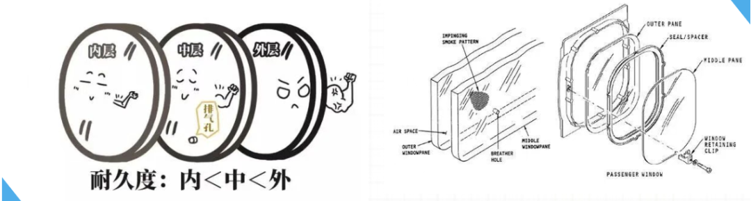 最外层和中间层的密封层用较厚且高强度的透明树脂材料制成,具有承受几倍座舱内外压差的能力。外层最坚固,直接承受 90%以上的压力差,是主要承力层。中间层带有通气孔,也叫“呼吸孔”,是大家平常看到的飞机窗上的小孔,它允许机舱内的高压空气缓慢进入夹层,使外层玻璃均匀受力。当压力调节失效时,外层玻璃会优先破裂,中层仍能作为备用承压层,是结构中的“安全缓冲层”。接触乘客的内层用较薄的轻质透明树脂材料制成,内层不密封不能承受压差,但是可以起到装饰和对中层辅助防护作用,能够防止被乘客刮伤或者碰撞。