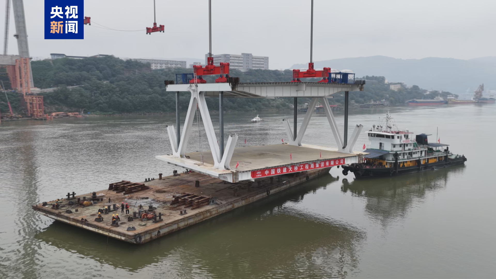 此次施工的首节段钢桁梁宽36.5米,长22.5米,高14米,吊重达695吨,相当于350辆轿车的总重量,是目前长江上游地区所建桥梁中单节段重量最大的钢桁梁。在施工中应用“工厂预制钢桁梁节段+现场吊装拼接”技术,在工厂标准化生产精度高、质量可控的钢桁梁,通过6艘川江舱船从重庆中江制梁基地运输160公里。到达现场后通过缆载吊机对江中船上直取方式吊装,减少了水上作业时间,降低了长江水势、航道管制等外部因素对工期的影响。