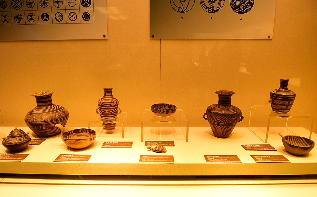 △甘肃省博物馆彩陶展厅展出的仰韶文化陶器