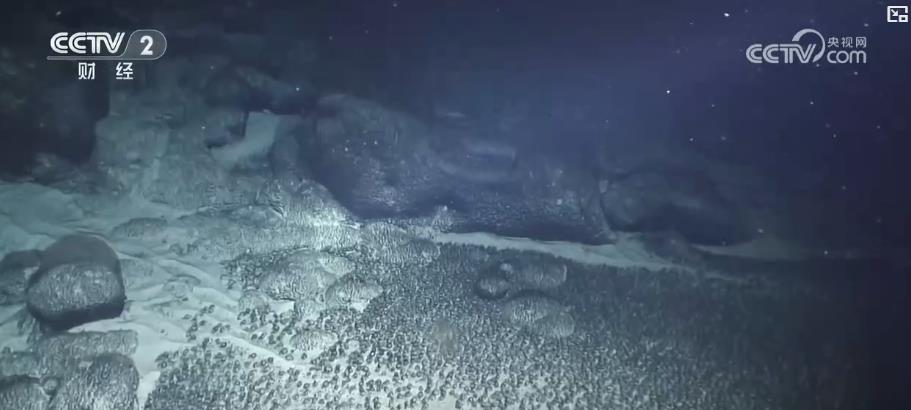 这段视频拍到的是海底多金属结核,主要分布于水深4000—6500米的深海盆地。其形态多为球形、椭球形、和碎屑状,结核的直径主要在3—10厘米,表面呈黑色或黑褐色,主要由铁锰氧化物及氢氧化物构成,富含钴、镍、铜、锰等关键金属元素。