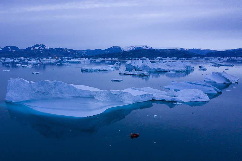 △当地时间2019年8月15日,格陵兰东部,一艘船在夜晚航行在巨大的冰山旁边。