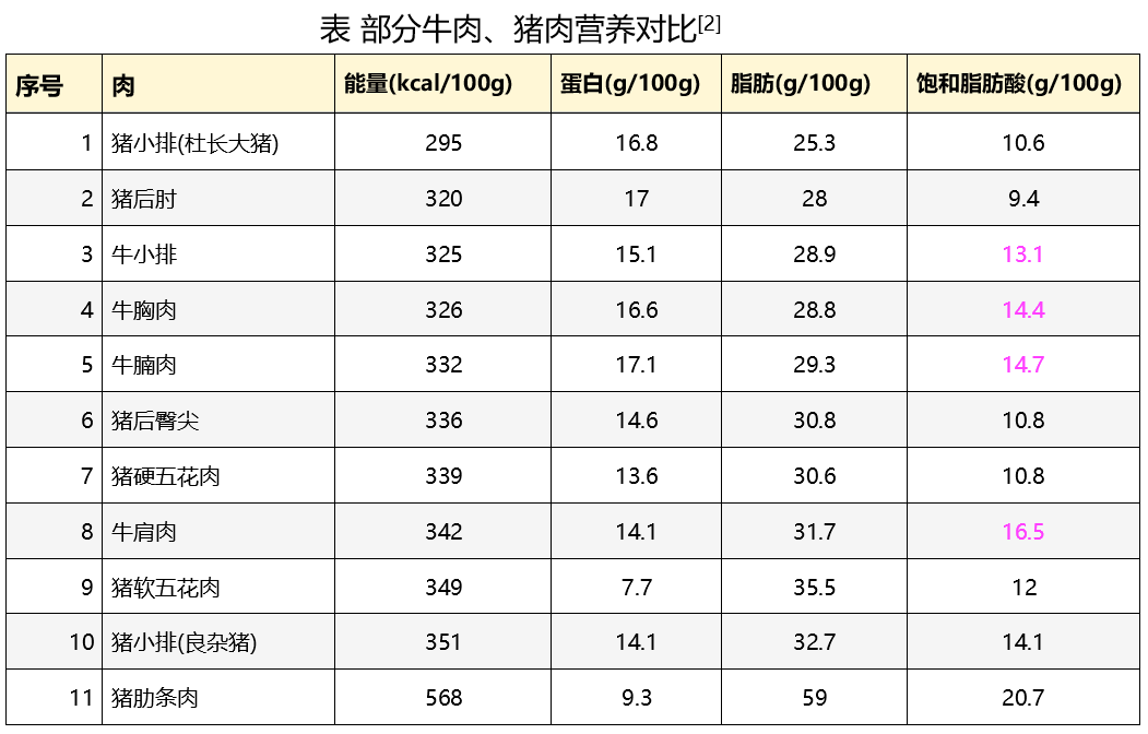 上面这11种肉中,很明显牛肉的饱和脂肪酸含量更高,所以仅从这一点来说,也不能笼统地说牛肉比猪肉更健康。