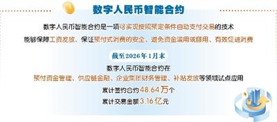 最新数据显示,截至2026年1月末,数字人民币智能合约在预付资金管理、供应链金融、企业集团财务管理、补贴发放等领域试点应用,累计签约合约48.64万个,累计交易金额3.16亿元。