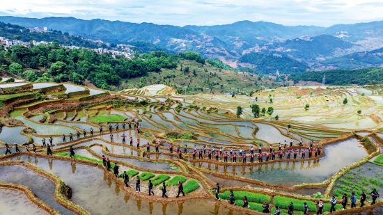 2025年5月2日,在云南省红河县甲寅村“开秧门”仪式上,村民身着民族服饰,沿着田埂踏歌而行。