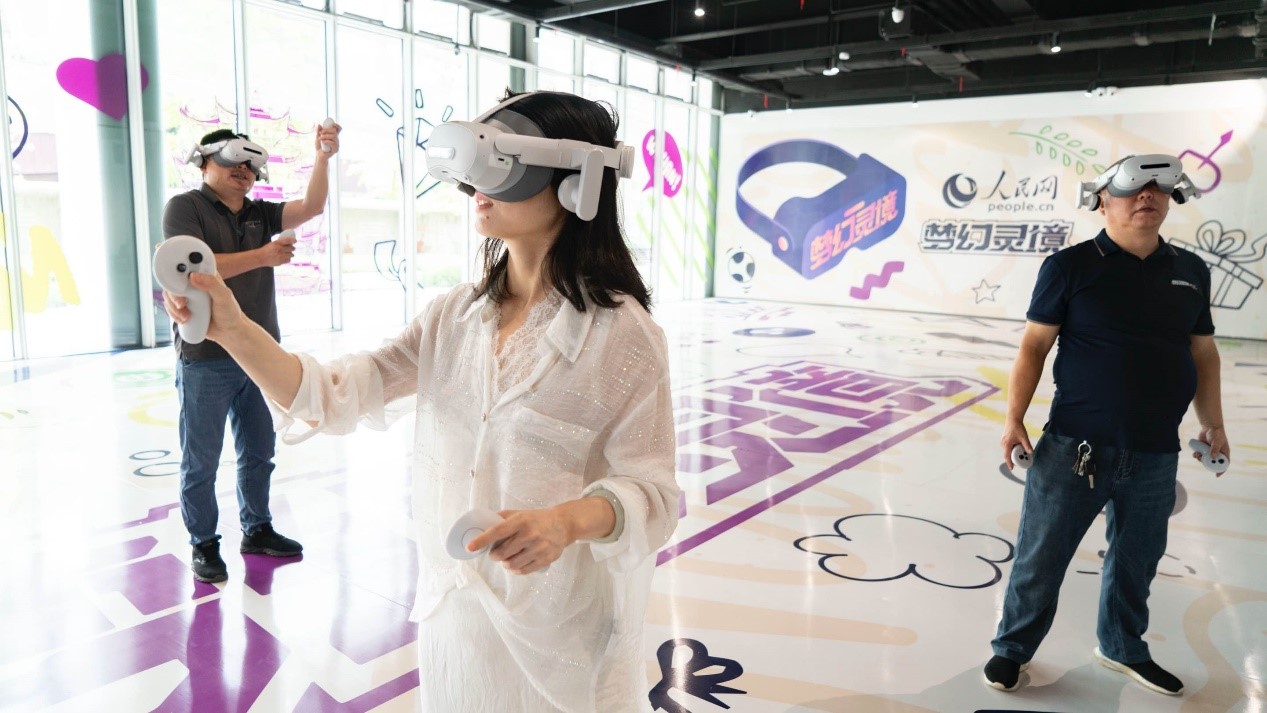 玩家佩戴VR设备在人民网·梦幻灵境AI+XR大空间中体验